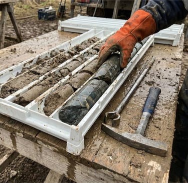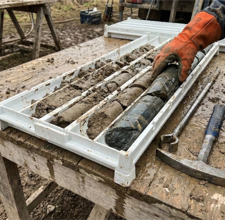 Gambar di atas menunjukkan proses nyata logging core di lapangan: sampel basah, kondisi berlumpur, handling manual, dan tekanan waktu. Di kondisi seperti ini, core tray bukan sekadar wadah, tetapi alat kontrol kualitas data geologi.